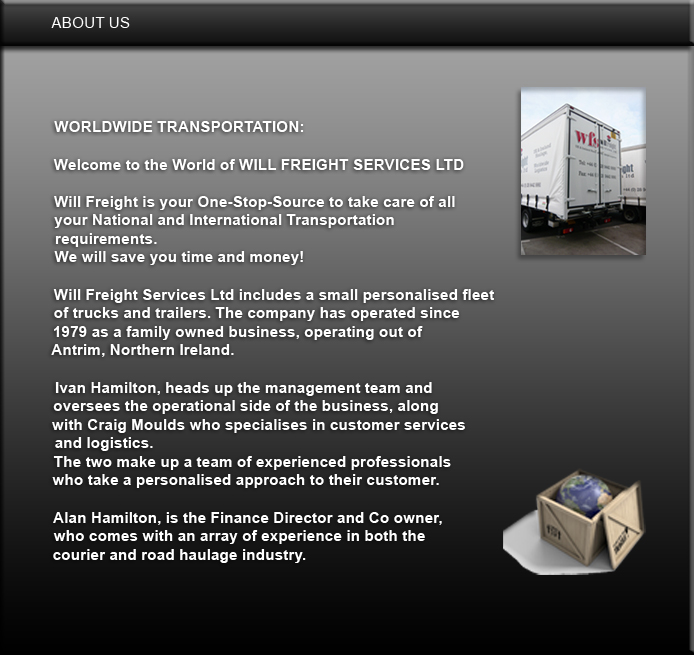 Copyright © 2009 Will Freight Services Ltd, All rights reserved. Registered Number 13381 Registered Address: Unit B4 Antrim Enterprise Agency, 58 Greystone Road, Antrim, BT41 1JZ